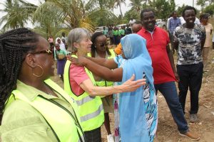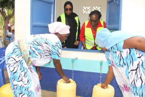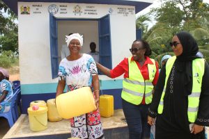 Lewnida Sara, the Task Team Leader for the WSDP, accompanied by the Acting Managing Director of the Mombasa Water Supply and Sanitation Company (MAWASSCO), Habiba Ali, visited the Bwaga Moyo village water kiosk to assess service delivery and interact with beneficiaries. During the visit, the two officials were seen assisting residents, including villager Tsadza Mreje, as they accessed clean and safe water from the facility.